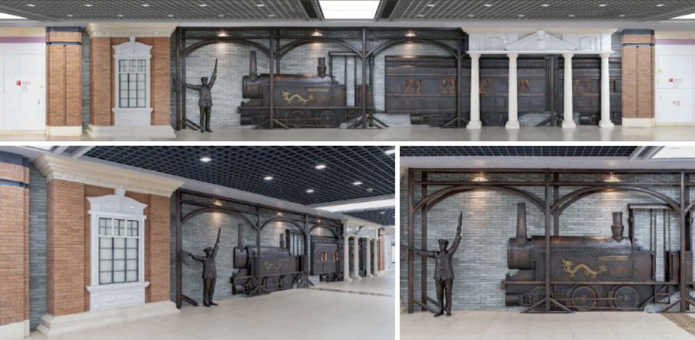 地鐵六號線工業(yè)文化主題站-復興路站《鐵路風云-龍?zhí)枡C車》浮雕墻